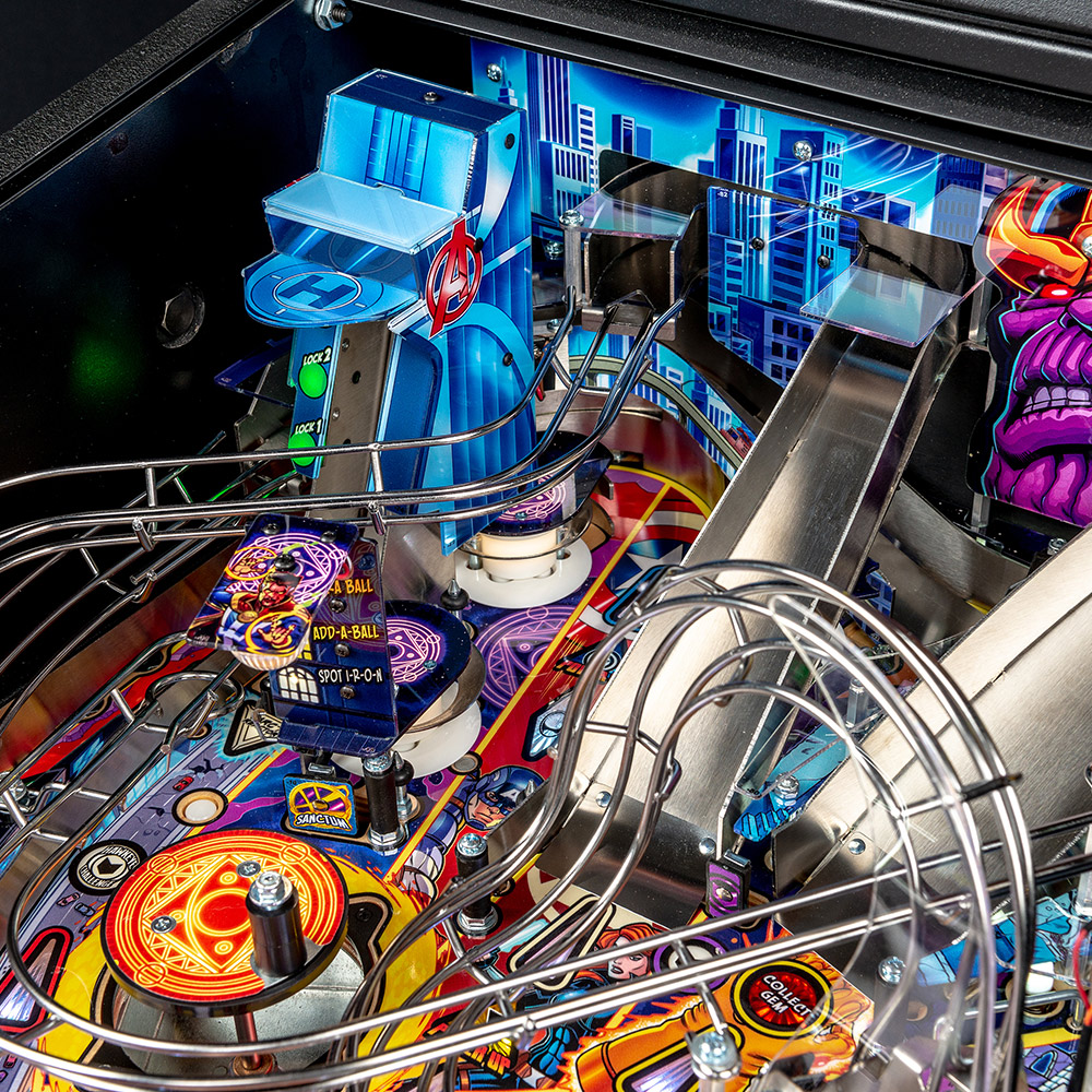 The Premium and Limited Edition models feature an interactive Dr. Strange motorized pop-up disc scoop, transporting pinballs into an underground Portal, a visible subway capable of holding and staging up to 3 balls through custom playfield windows accentuated with dynamic RGB lighting effects. These models also include a custom sculpted Thanos Infinity Gauntlet integrated with atmospheric light-up gems, a Captain Marvel inverse gravity custom wireform ramp, and a Pym Laboratories vertical up-kicker.
