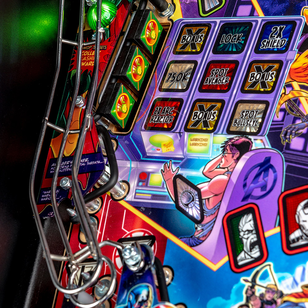 The Pro, Premium, and Limited Edition models all feature an interactive Dr. Strange spinning kinetic sling ring disc with dual direction velocity detection, aiding players on their journey to opening portals and starting Infinity Gem quests. All models feature a gravity defying Avengers Tower magnetic lock ramp with gravitational vari-target and magnet hold, capturing pinballs in midair as players unlock Iron Man Multiball. In addition to distinct hand-drawn artwork, all models feature an Avengers Computer Bingo grid 3-target drop bank, a Thor captive ball, Hulk spinning target, custom intricate wireform ramps, and 3 full size flippers.