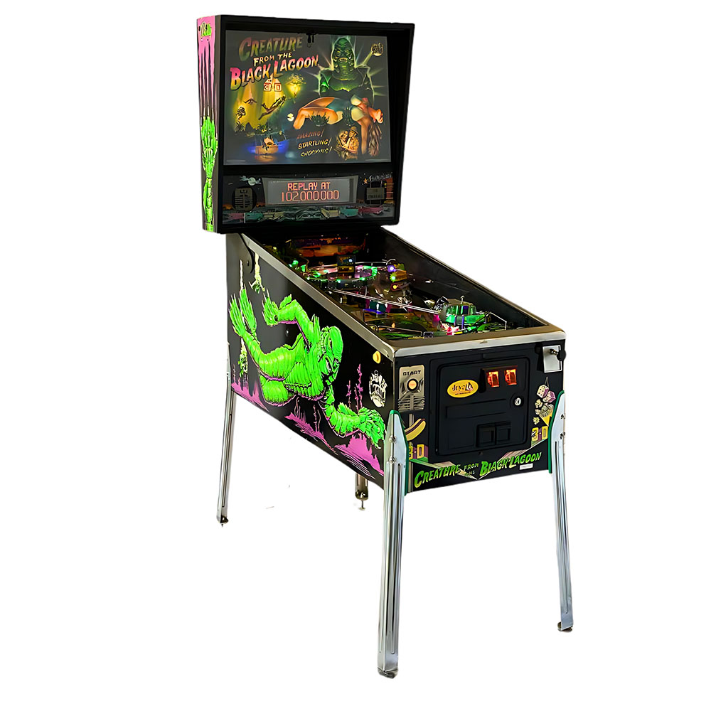 This game is becoming one of the hardest titles to find lately. Relive all your 50s memories with this fun family friendly pinball. One of the most innovative toys in pinball has been the Creature from the Black Lagoon hologram which lights up under the playfield when you light the video mode! The Creature moves back and forth taunting you! Follow the scrolling lights and shoot up the whirlpool ramp to start a multiball feature or shoot the Snack Bar targets for big bonus points. There are tons of other cool features to this game. This game was owned by a fellow collector and has the following upgrades. -New coin door installed. -New legs, leg levelers, leg bolts and leg cabinet protectors have been added. -New display was recently installed. -New glass was installed.-Recently shop out with new lights and rubbers. This game is sure to be a hit with any family!