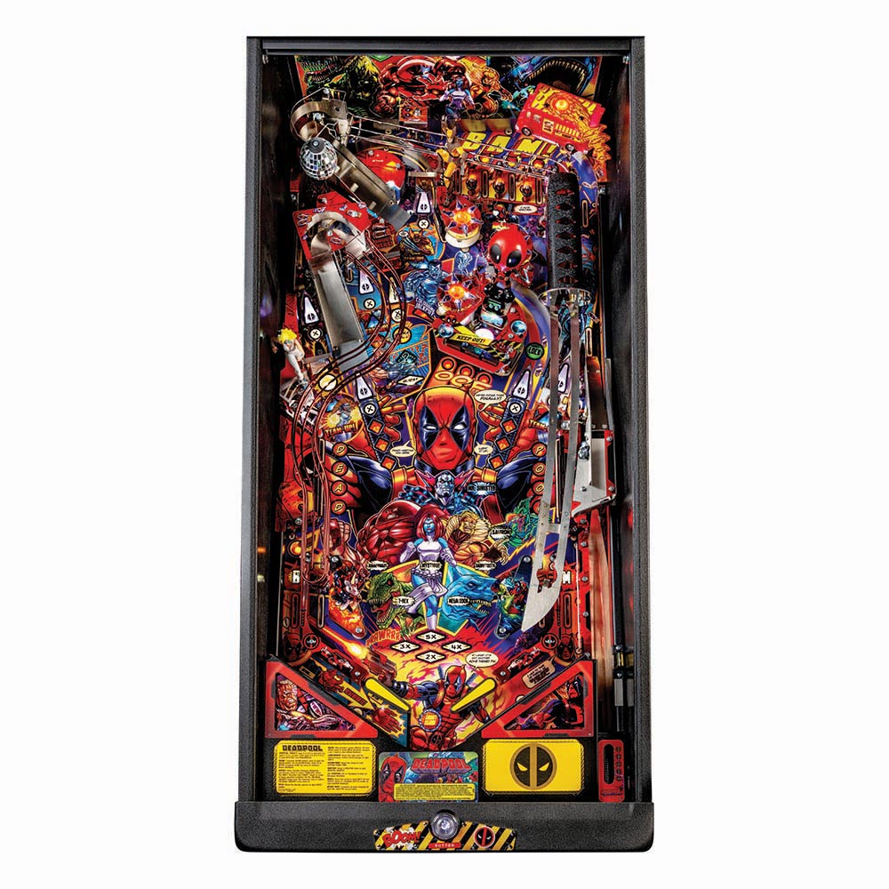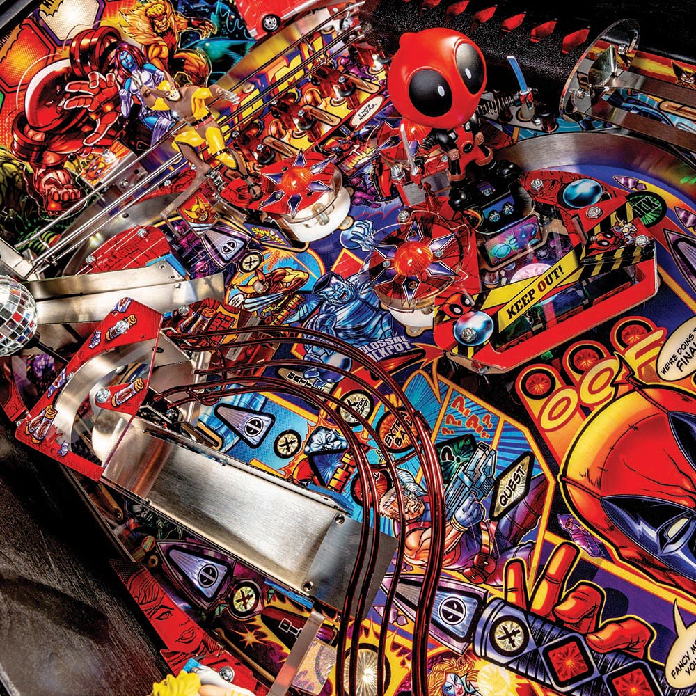Stern’s Deadpool Pro, Premium, and Limited Edition models feature stunning and distinctive hand-drawn art by renowned illustrator Zombie Yeti. Well known actor Nolan North stars as the eccentric voice of Deadpool. Each game features a 3-bank drop target with a ball lock that’s guarding a custom molded Lil’ Deadpool bash toy target. In addition, all models include two stainless steel and wireform ramps with a Katana Sword ramp return. Deadpool pinball entertains with an amazing array of ninjas, vampires, and chimichangas, making it suitable for all skill levels.