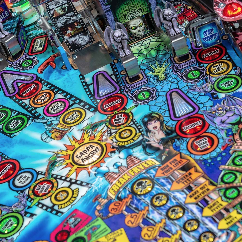 The taunting is over and the haunting begins in the third and campiest installment of the Elvira pinball trilogy!  Trying to sell her mansion through “Alternate Realty”, Elvira’s house is haunted by the movie characters from her past.  These ghouls, ghosts, monsters, and strange assortment of vintage characters with horrific acting skills seek revenge on Elvira while she and the player confront them, sending them back to the “film” from which they came!  Elvira’s House of Horrors immerses players in a fun, campy, B-movie universe filled with all of the humor expected from the Mistress of the Dark including custom speech and, in a pinball first, exclusive filming of Elvira for custom video scenes featured throughout the game!
