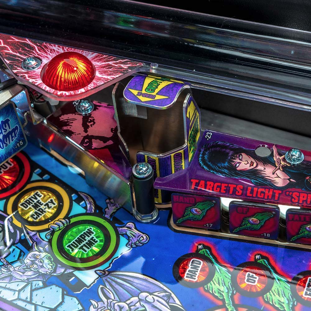 The Premium, Limited Edition, and Signature Edition models all feature Elvira’s “House of Horrors”, a frightening Victorian fixer-upper, full of creepy charm and supernatural surprises.  Players can gain access to the mansion through the front door, the cellar, or through the garage which is guarded by a gravestone drop-target.  An orchestra of color changing RGB lights accentuates the house in sync with the different “House Haunts” featured throughout the game.  Lighted windows and a spinning attic turret track players’ progression on their pinball journey.