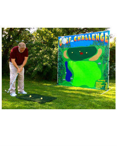 The Golf Challenge frame game comes with its own framework and heavy-duty vinyl canvas. The colorful backdrop, which is designed to look like a golf course, is Velcro-receptive, so the special Velcro practice golf balls stay right where you hit them. For pros or novices alike, this game can quickly become addictive. This compact, low-maintenance, low-cost unit will really boost your profit potential. Like all of our games, Golf Challenge can be set up in less than five minutes and can be used indoors or out.