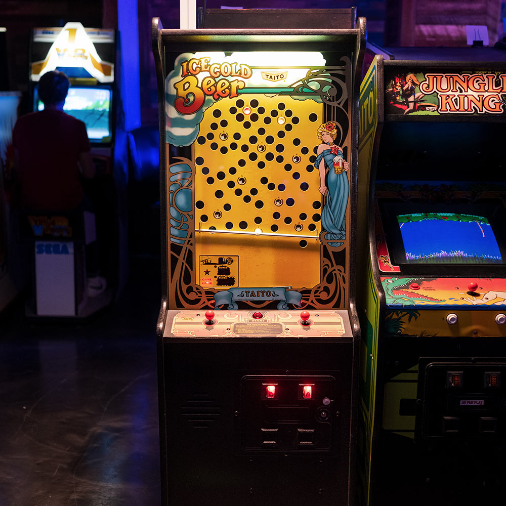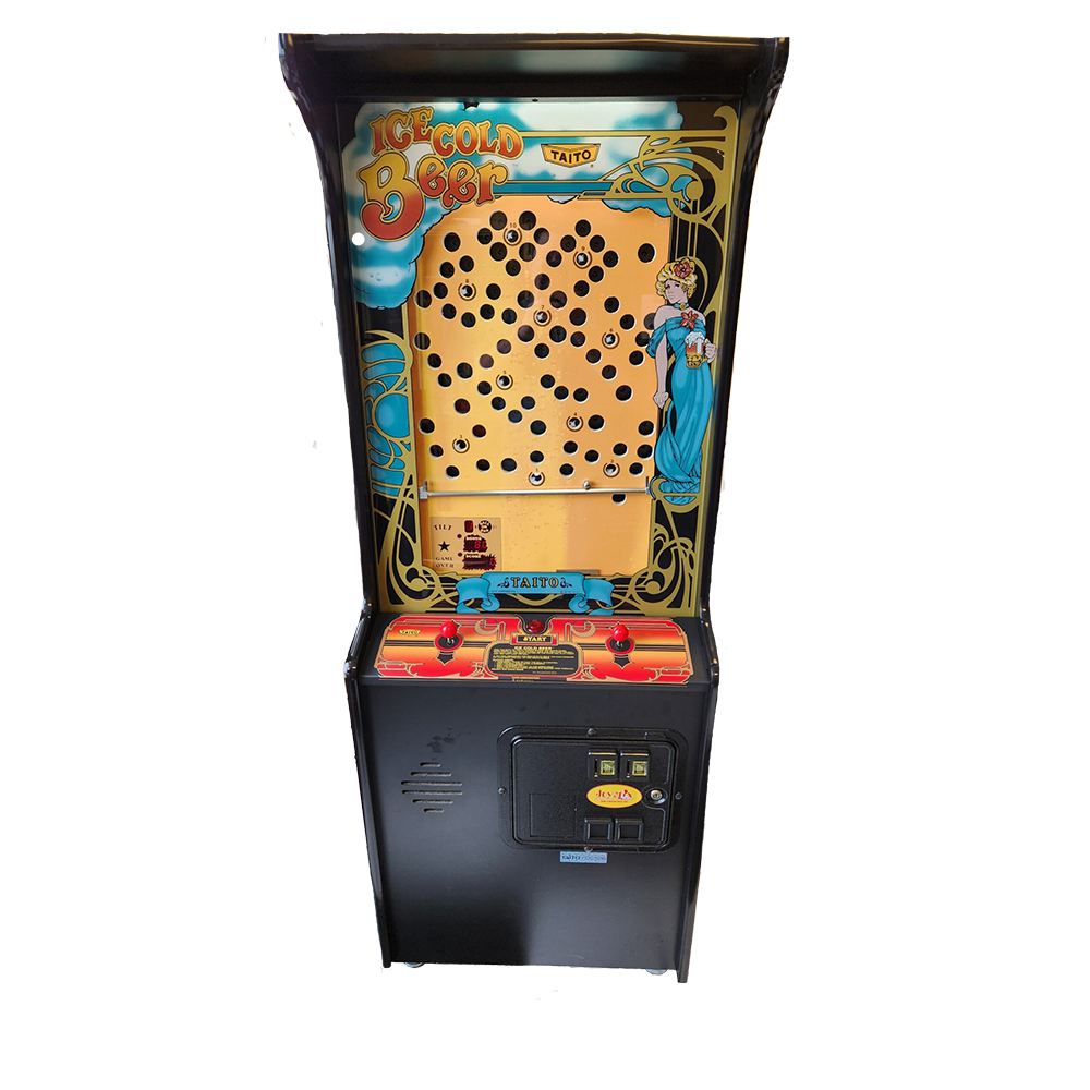 Ice Cold Beer is a mechanical arcade game originally released by Taito in 1983. The game is in a similar cabinet to an arcade video game but there is a vertical wooden playfield dotted with holes. Two joysticks on the control panel control the height of the two ends of a metal bar that moves up and down the playfield, with a ball bearing rolling back and forth on the bar.