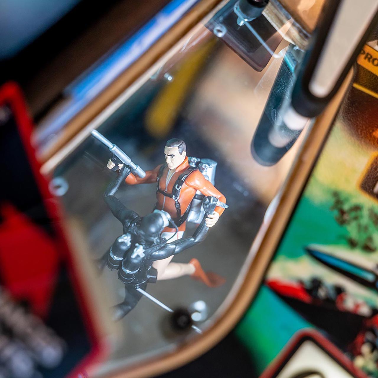 Gather gadgets from Q Branch as pinballs get ejected through the roof of a custom sculpted Aston Martin DB5. Break through the Osato Chemicals drop targets to battle SPECTRE at the Bird 1 rocket base. And hold your breath on the gravity defying, magnetic jetpack as it transports pinballs across the playfield.