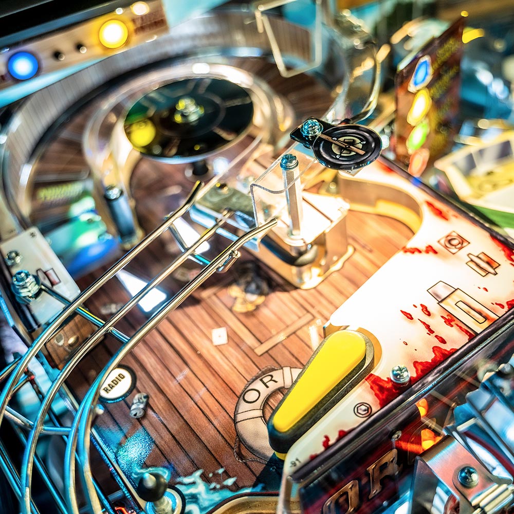 Stern’s JAWS pinball games will have players grabbing their harpoons and playing as Quint, Hooper, and Brody to save Amity Island’s residents and the Fourth of July! As the grizzled fishermen, tackle the most dangerous ocean creatures on the planet. Tension mounts as you see “blood in the water” from our animated lighting effects. Fire pinballs at the motorized “Shark Fin” target swimming across the playfield. Anticipation builds as you navigate the “Orca Boat” upper playfield, featuring a “Lookout Tower” ramp, a ship’s wheel horizontal spinner on the deck, and a “Radio” stand-up target to call for help. Lookout! A motorized custom sculpted “Great White Shark” bash toy comes crashing through the bottom of a fishing boat, terrorizing players in this thrilling pinball odyssey. Will you survive JAWS?!