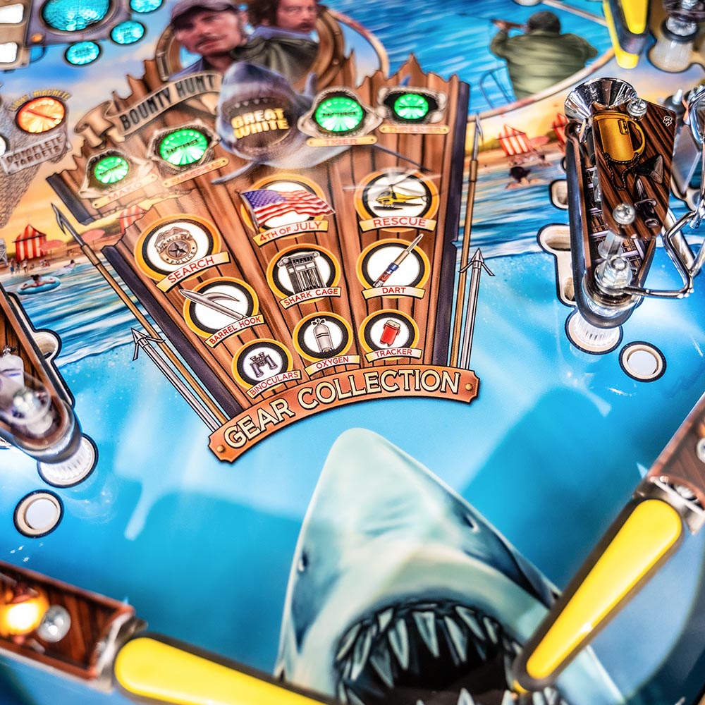 JAWS pinball games include Stern’s award-winning Insider Connected™ system, which enables players to interact with the game and a global network of players in multiple ways. Through Insider Connected, players can track progress, hunt Achievements, take on special JAWS Quests, and work on their lifetime Bounty Hunter rank.