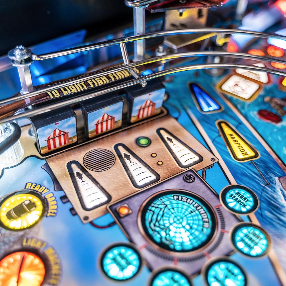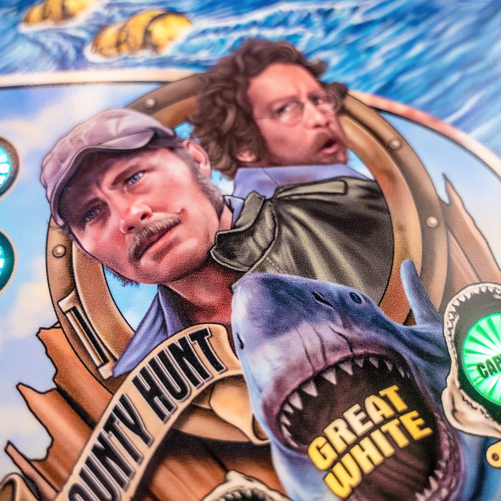 Stern’s JAWS pinball games will have players grabbing their harpoons and playing as Quint, Hooper, and Brody to save Amity Island’s residents and the Fourth of July! As the grizzled fishermen, tackle the most dangerous ocean creatures on the planet. Tension mounts as you see “blood in the water” from our animated lighting effects. Fire pinballs at the motorized “Shark Fin” target swimming across the playfield. Anticipation builds as you navigate the “Orca Boat” upper playfield, featuring a “Lookout Tower” ramp, a ship’s wheel horizontal spinner on the deck, and a “Radio” stand-up target to call for help. Lookout! A motorized custom sculpted “Great White Shark” bash toy comes crashing through the bottom of a fishing boat, terrorizing players in this thrilling pinball odyssey. Will you survive JAWS?!