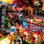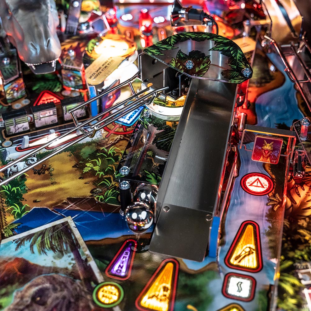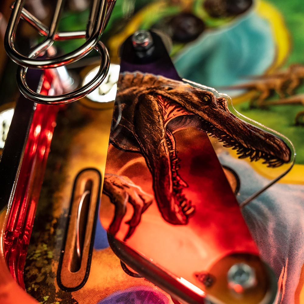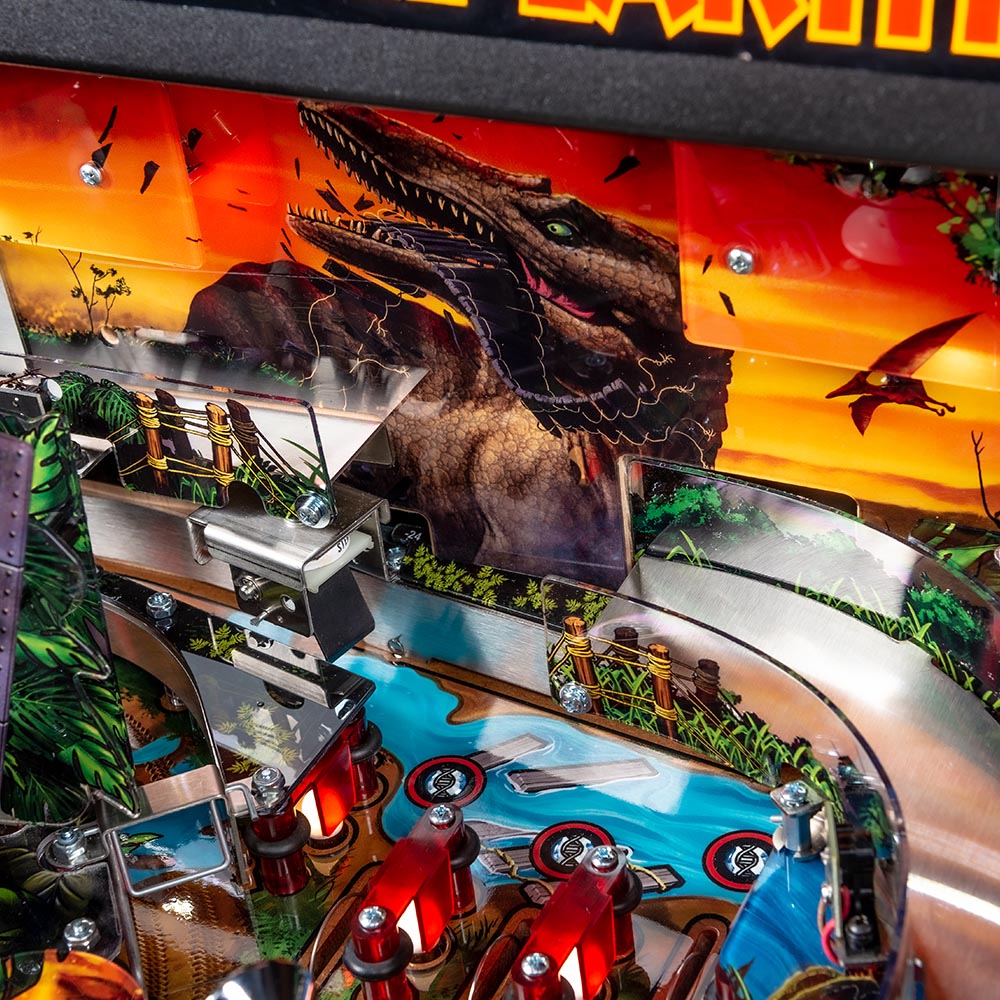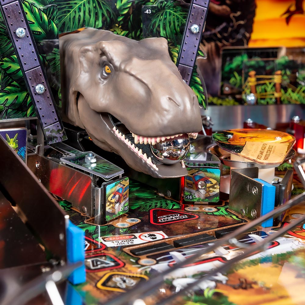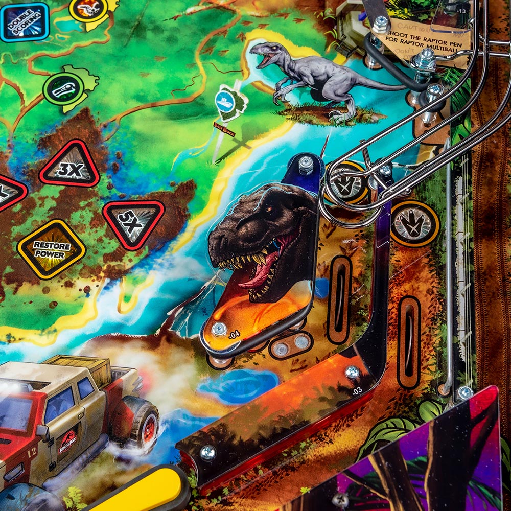 Jurassic Park Pin brings to life the most fearsome predator ever to walk the earth with an interactive, custom sculpted T. rex. Players will battle against the Spinosaurus by bashing a captive ball and corral Raptors in their enclosed pen with precision shooting. Fast flowing metal ramps, lightning quick spinners, and kinetically satisfying physical drop targets will provide players with an adrenalized game experience packed with unmatched action and fun. The all-LED playfield lighting provides dazzling light shows in sync with the iconic Jurassic Park theme music to create an immersive pinball experience.