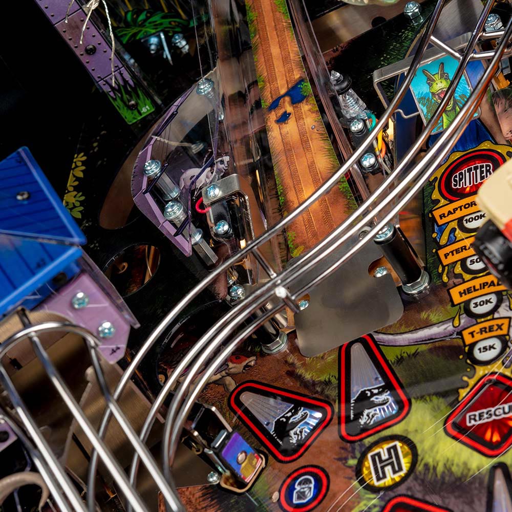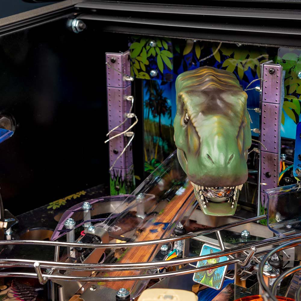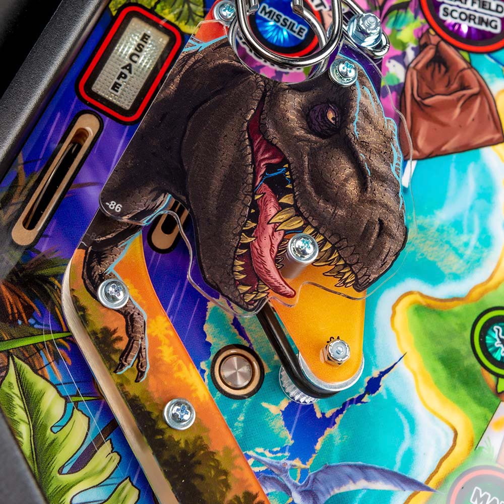 The Premium and Limited Edition models feature an amazing animatronic ball-eating, ball-throwing T. Rex that interacts with the ball and the player. These models also include an interactive Raptor and Raptor Pen featuring a ball-lock mechanism guarded by a motorized gate. The action does not let up with unique mosquito-in-amber pop bumpers and a custom metal horizontal helicopter spinner.