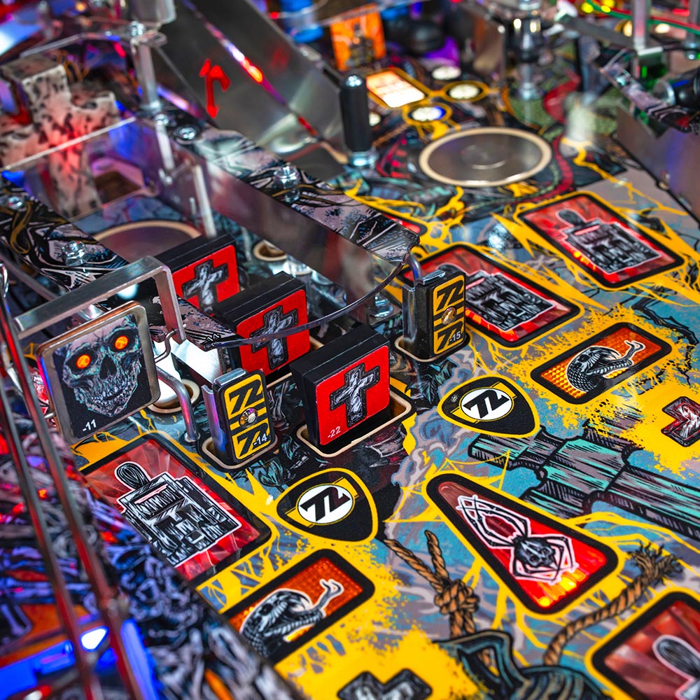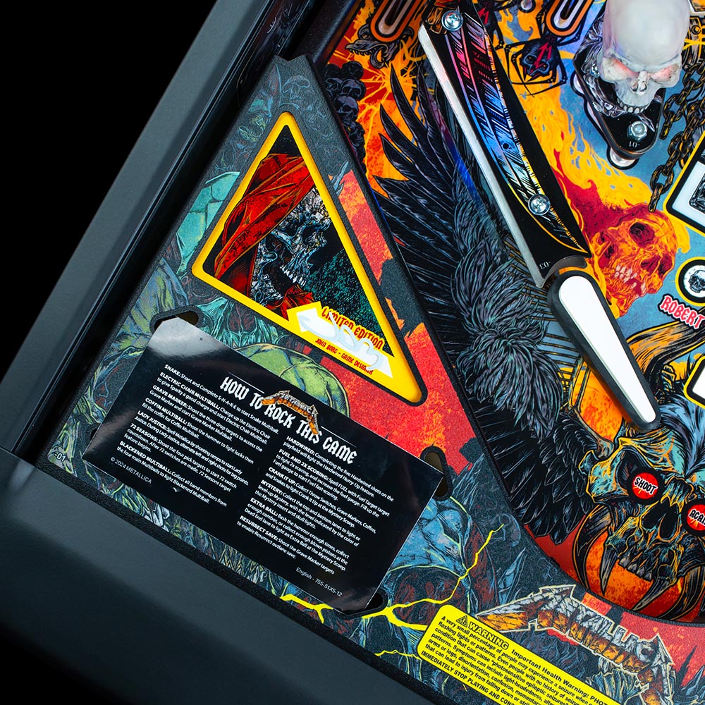 John Borg’s classic playfield architecture has been enhanced with three all-new sculptures: Sparky, the Hammer, new RGB-illuminated Skulls, and a new Metallica logo spell-out on the back panel. Dramatic UV lighting effects have been implemented throughout the playfield and on Sparky, and the game includes numerous quality and durability refinements.