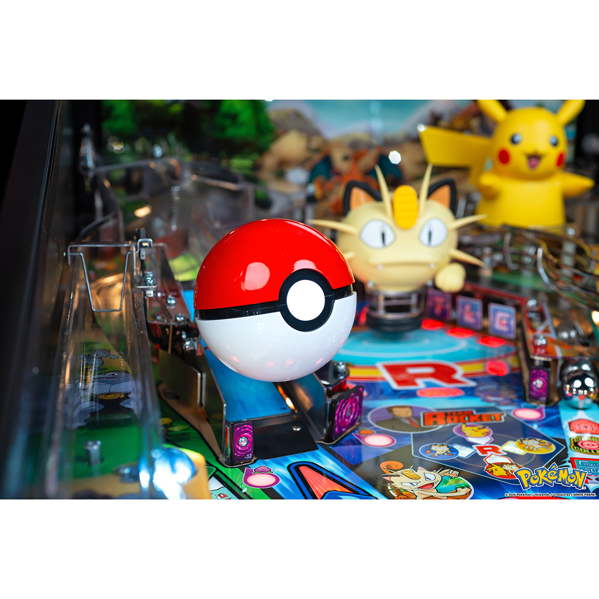 In Pokémon by Stern Pinball, Trainers embark on an unforgettable journey across four distinct habitats, discovering, catching, and bonding with many of their favorite Pokémon. Players will shoot the illuminated, mechanically animated Poké Ball to catch Pokémon, build their ultimate team, and complete their Pokémon Collection. The playfield also features beautifully crafted Pokémon-themed ramps, spinners, and targets. Watch as the animatronic Pikachu reacts to your gameplay, cheering you on every step of the way! Trainers can battle their way through rival trainers and compete in the arena through dynamic, custom battle sequences. Danger lurks as Team Rocket and their infamous boss, Giovanni, plot trouble. The interactive Meowth Balloon toy swoops down onto the battle arena to challenge the Trainer. Premium and Limited Edition games include an interactive electromagnet that adds chaos to the battle arena.