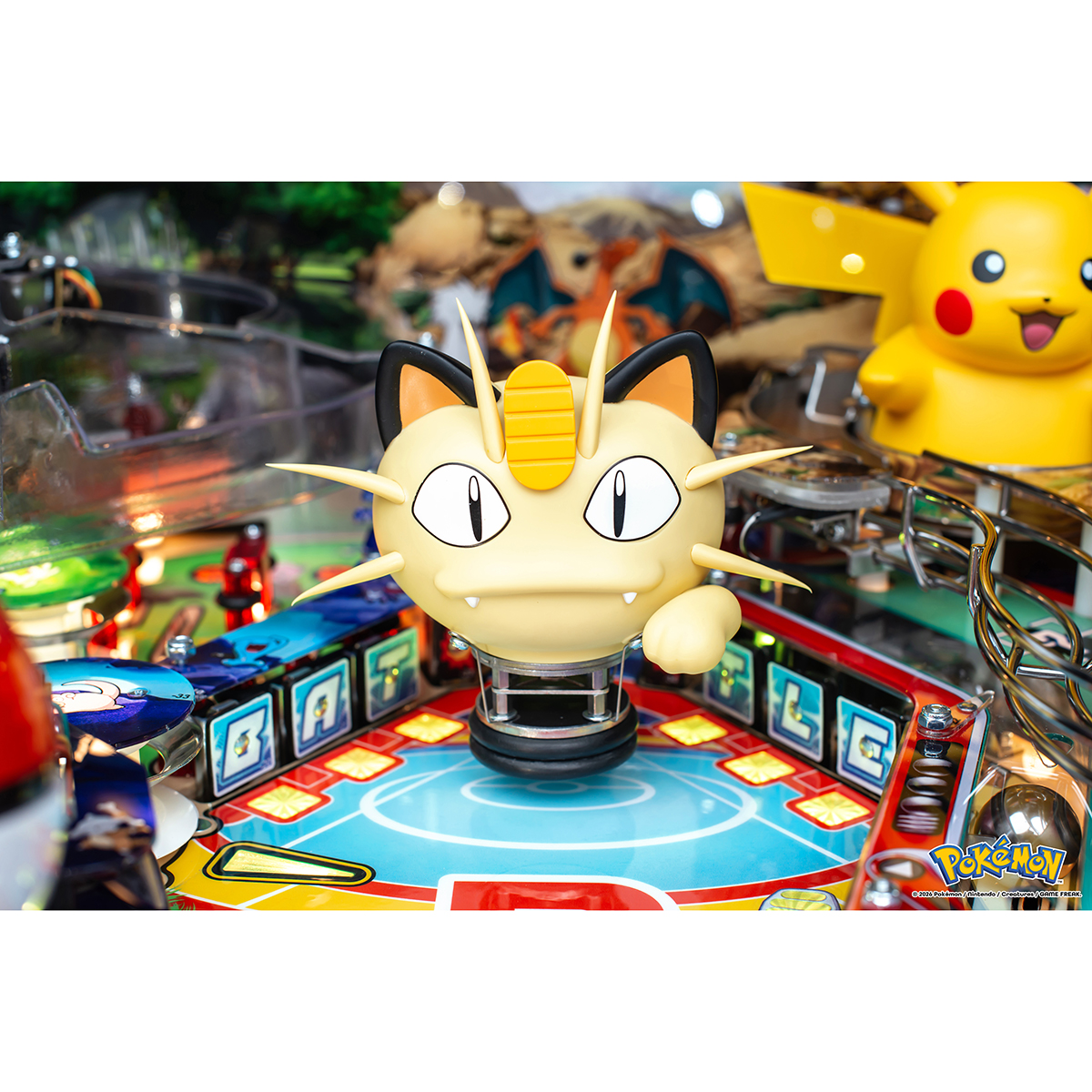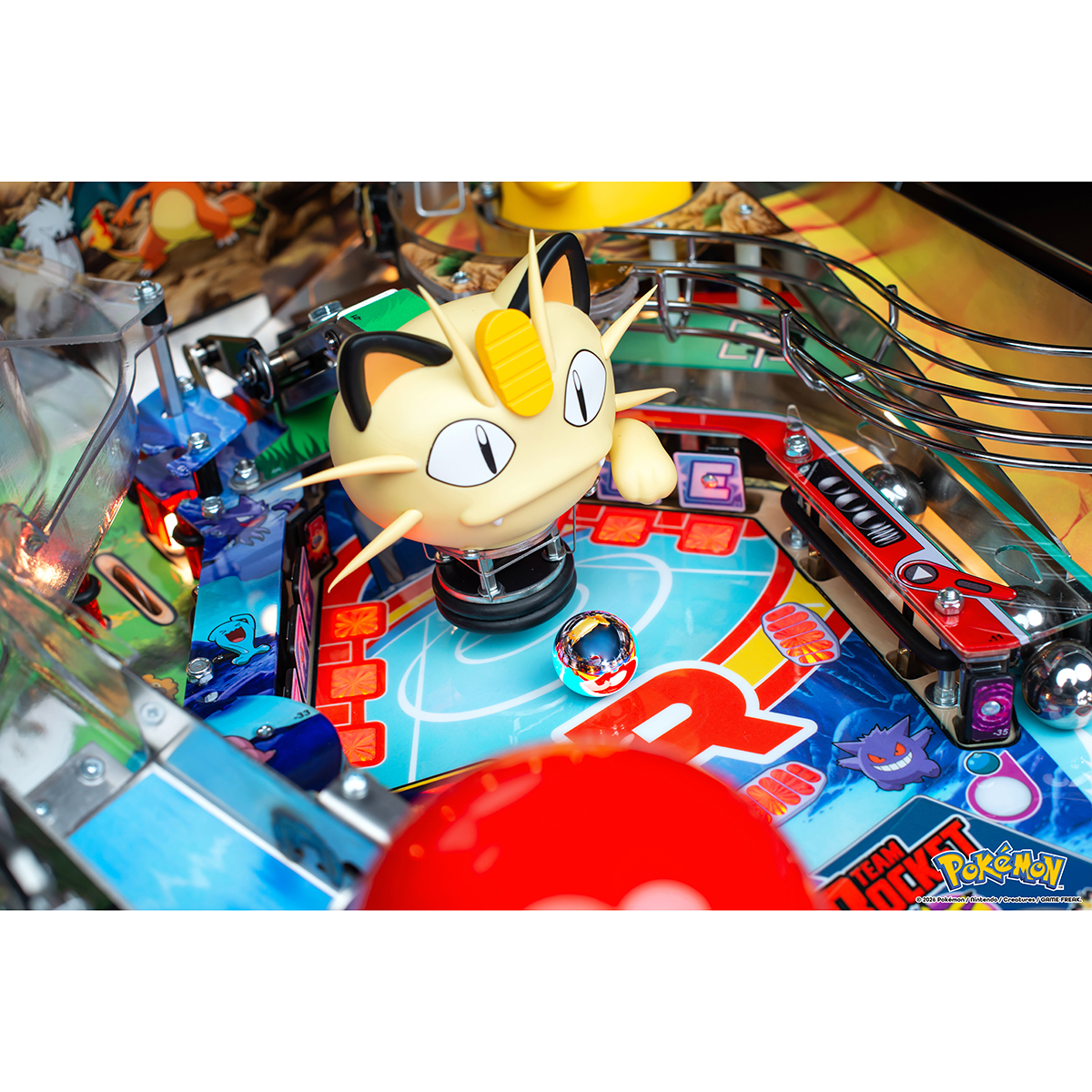 In Pokémon by Stern Pinball, Trainers embark on an unforgettable journey across four distinct habitats, discovering, catching, and bonding with many of their favorite Pokémon. Players will shoot the illuminated, mechanically animated Poké Ball to catch Pokémon, build their ultimate team, and complete their Pokémon Collection. The playfield also features beautifully crafted Pokémon-themed ramps, spinners, and targets. Watch as the animatronic Pikachu reacts to your gameplay, cheering you on every step of the way! Trainers can battle their way through rival trainers and compete in the arena through dynamic, custom battle sequences. Danger lurks as Team Rocket and their infamous boss, Giovanni, plot trouble. The interactive Meowth Balloon toy swoops down onto the battle arena to challenge the Trainer. Premium and Limited Edition games include an interactive electromagnet that adds chaos to the battle arena.