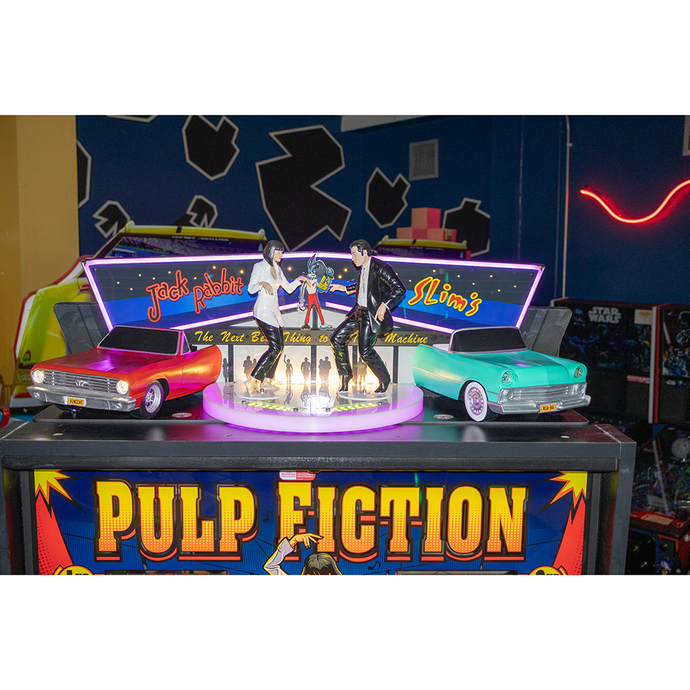 - Mirrored Backglass with Custom Hand-Drawn Artwork from Pulp Fiction’s Legendary Jack Rabbit Slim’s Dance Scene