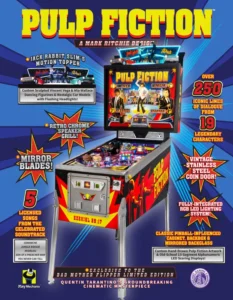 Pulp Fiction is a retro-inspired full-featured modern pinball machine. Developed at the request of Quentin Tarantino who wanted an 1980’s style Pulp Fiction themed pinball machine for his home. Tarantino’s continued involvement throughout the project shaped the final game. Tarantino rarely licenses his intellectual property, it is a unique privilege to produce a game which pays tribute to this masterpiece.Legendary pinball designer Mark Ritchie masterfully crafted a playfield which on its surface appears comparable to games from this era but outside of initial perception features more mechanisms and greater depth than most games produced today. David Thiel forcefully pulls the player into this world utilizing over 250 iconic lines from Pulp Fiction’s legendary cast, five licensed songs from the original movie soundtrack, and a number of original compositions. Josh Sharpe developed an approachable rule set that is both intuitive and deep enough to engage even the most skilled player. Scott Pikulski’s vintage inspired art package is both stunning and perfectly cohesive.