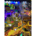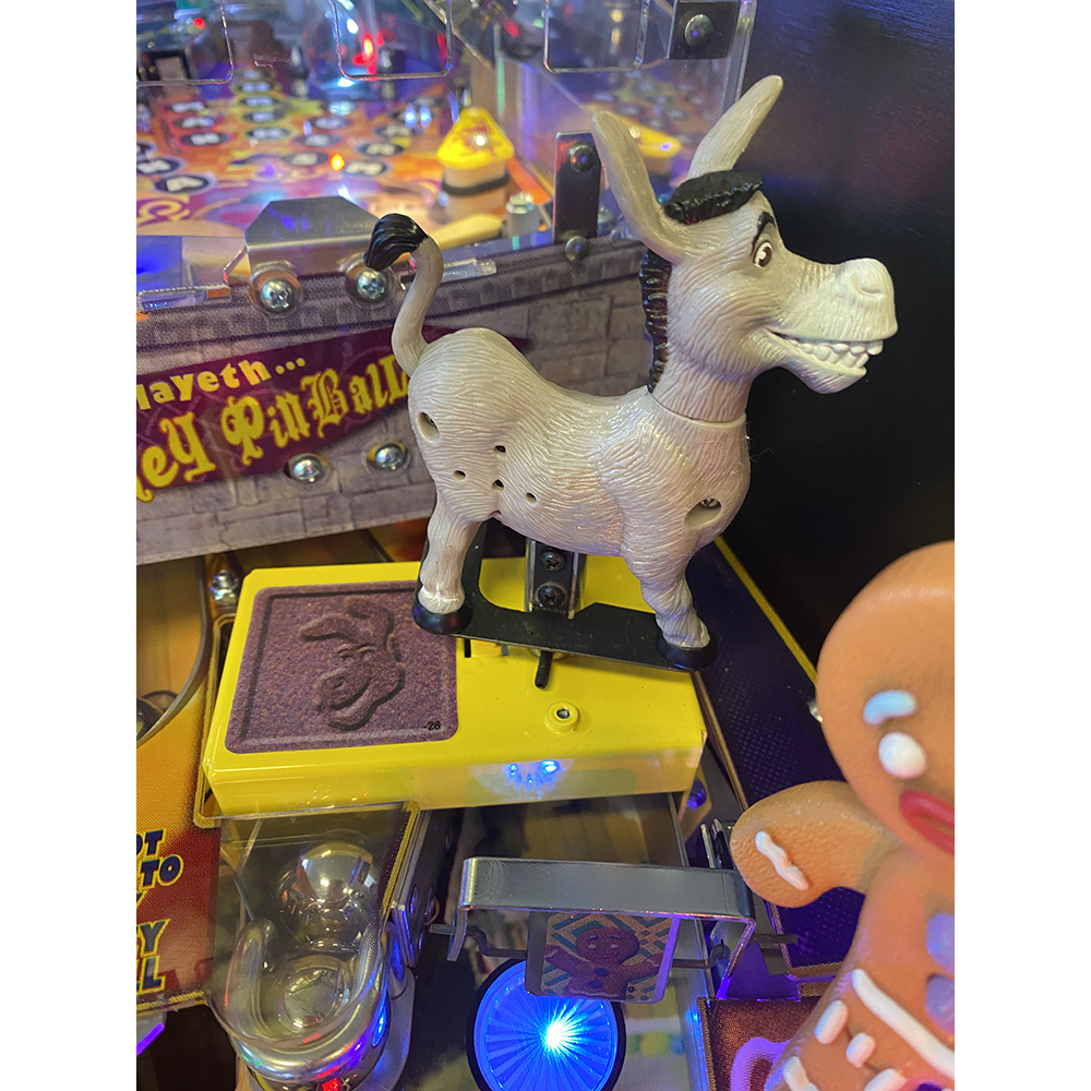 The SHREK pinball machine’s main feature is Donkey’s mini-playfield, a small pinball playfield that sits in the upper right hand corner. It has mini-flippers that the player controls with the regular flipper buttons when the game is in Donkey mini-playfield’ mode. The mini-playfield has ramps and targets to shoot at while an actual Donkey figurine spins in front of the mini-playfield.