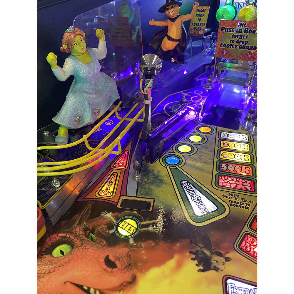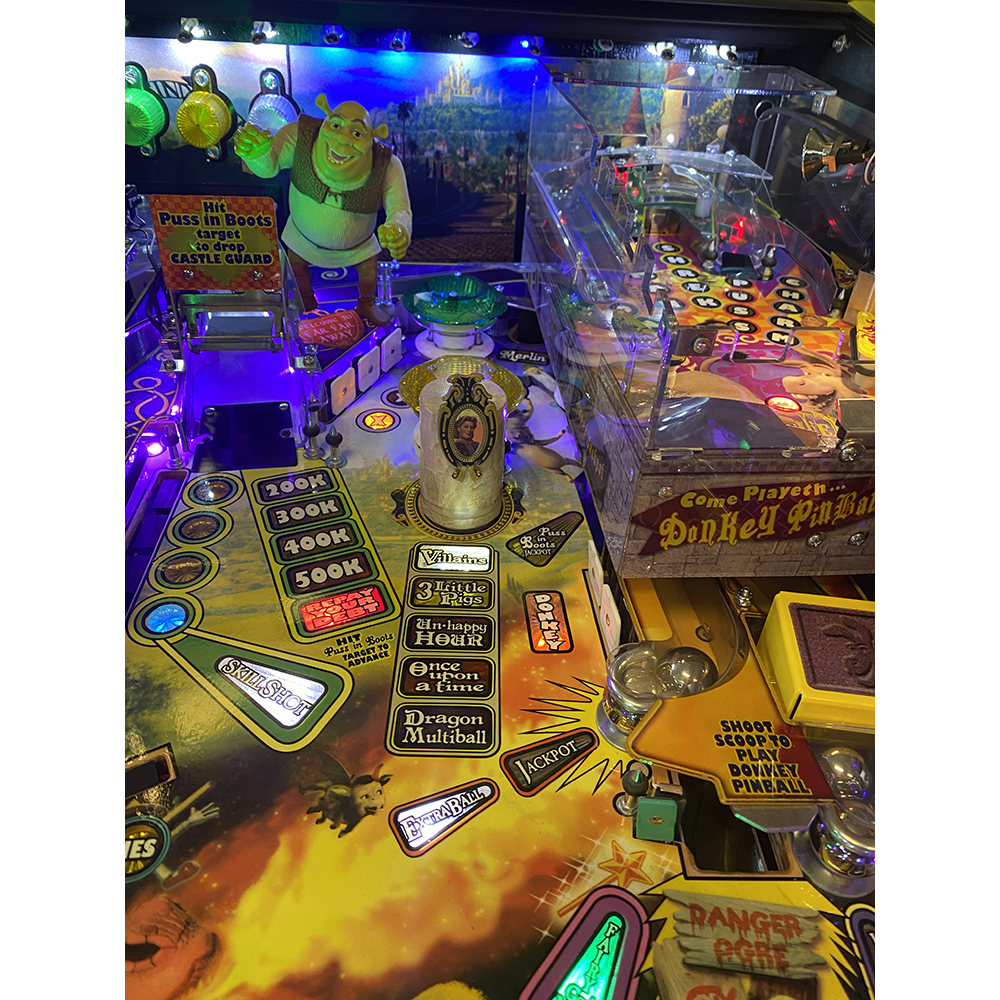 Additional features on the game include: figurines of five SHREK characters, including Shrek, Donkey, Puss in Boots®, Princess Fiona and Gingy®. A mirror sculpture of Prince Charming sits in the center of the playfield and can be struck by the pinball. Two captive pinballs spell out P-I-N-B-A-L-L when hit; and SHREK also includes plenty of exciting multi-ball action.