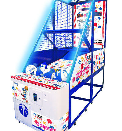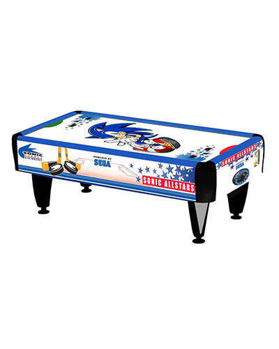 Sonic the Hedgehog is making his debut on this new two player air hockey from Sega. LED lights chase around the edges of the machine to add more excitement. When a goal is scored the LED lights flash and indicate the side the goal was scored on. The scoring is located under the playfield in the lower right corner eliminating damage like some other models where it is mounted on the side of the machine. The railings also have a overhang lip that prevents the puck from flying off the table.