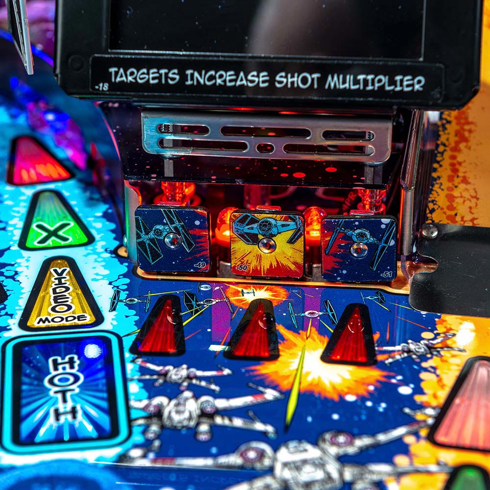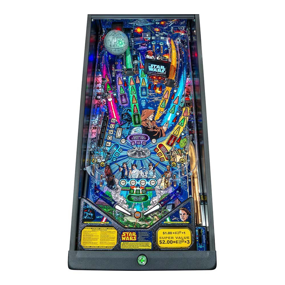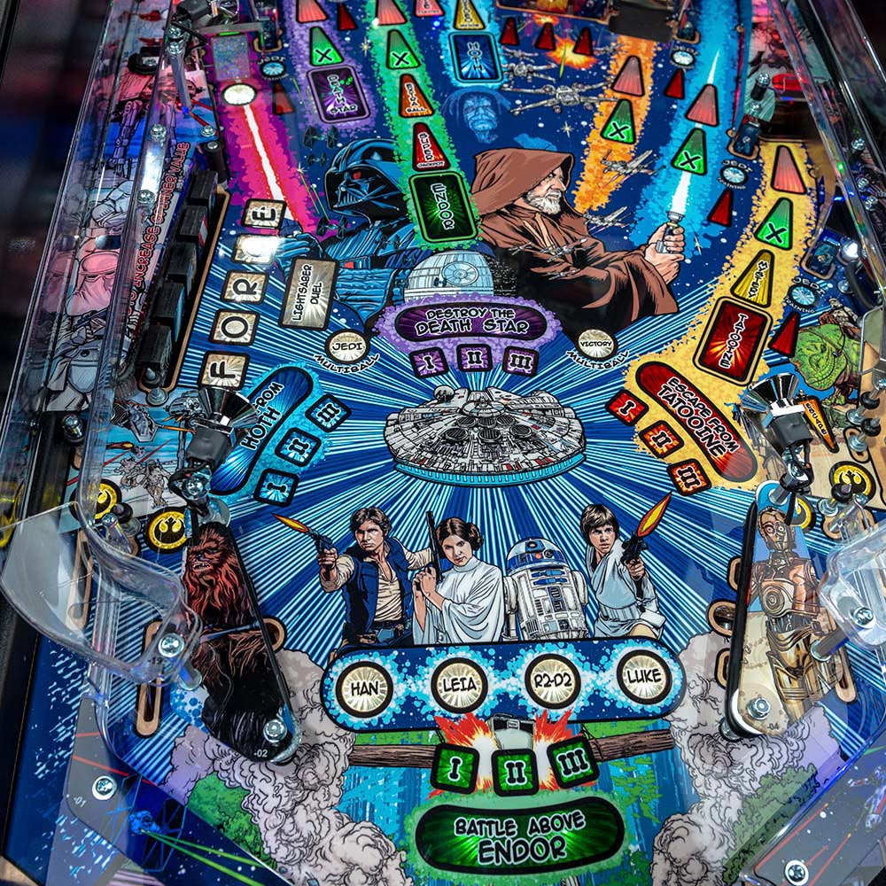 The Star Wars themed Comic Art Pro and Star Wars Comic Art Premium machines made by Stern are packed with features that provide an irresistible game experience. The game includes select dialogue and footage from the original Star Wars trilogy, color-changing LED-lighted inserts, and a sculpted TIE fighter. All models feature two LCD screens. The Premium model also features art representing an exploding Death Star, a sculpted LED-lit Millennium Falcon and an interactive hyperspace loop that encircles the playfield and can accommodate up to 5 pinballs at once.