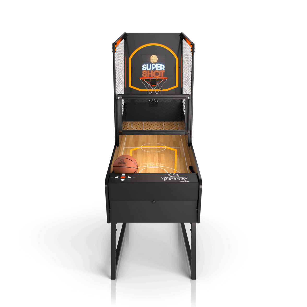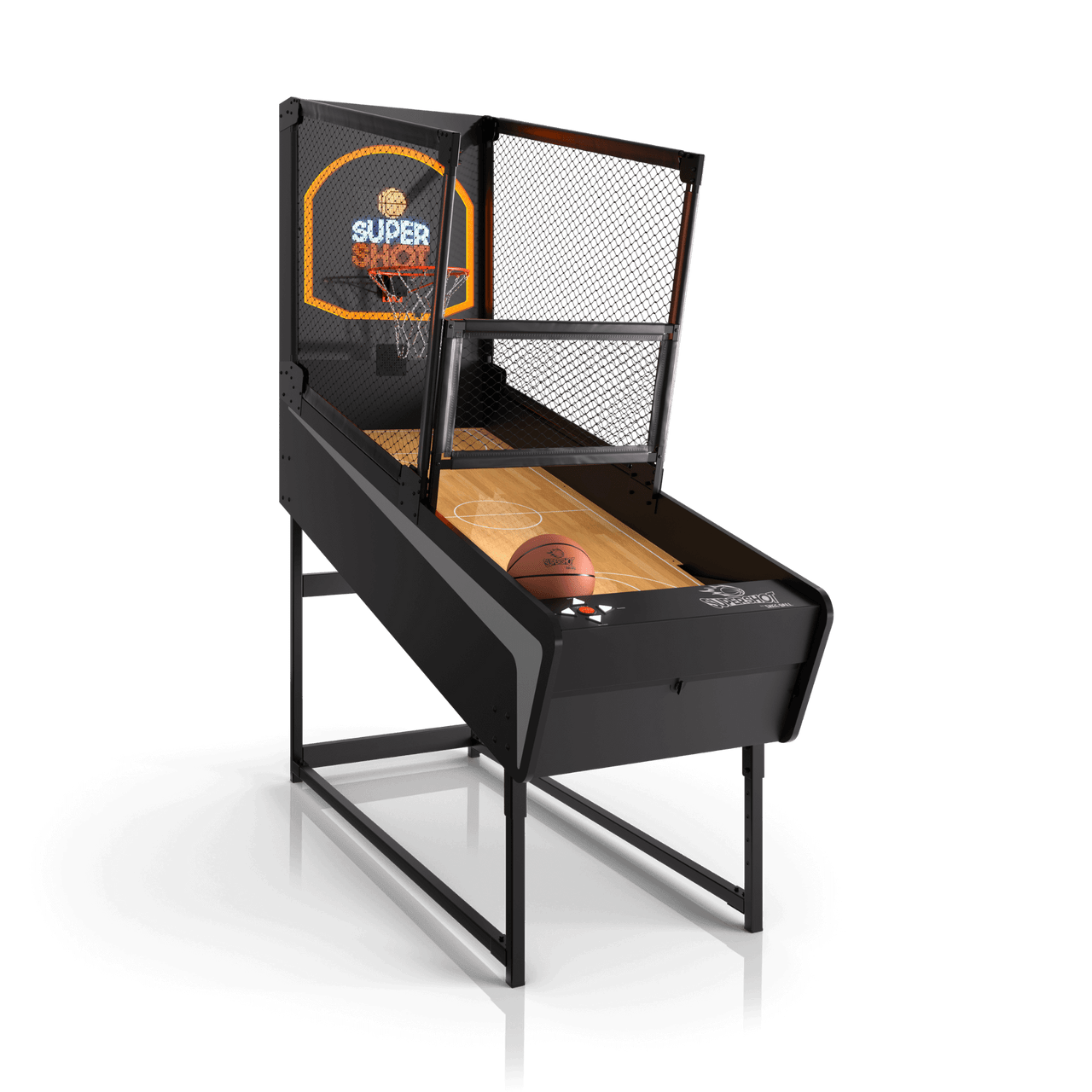 Clocking in at an adjustable 7’8” to 8’6″ tall, SuperShot® by Skee-Ball® is a premium in-home basketball game featuring a custom LED lit backboard nestled atop a sleek chainlink hoop for a larger-than-life experience with 8+ unique game plays for up to eight (8) players; from Classic Sprint and Arcade Endurance to Around the World and Elite Bracket Buster.