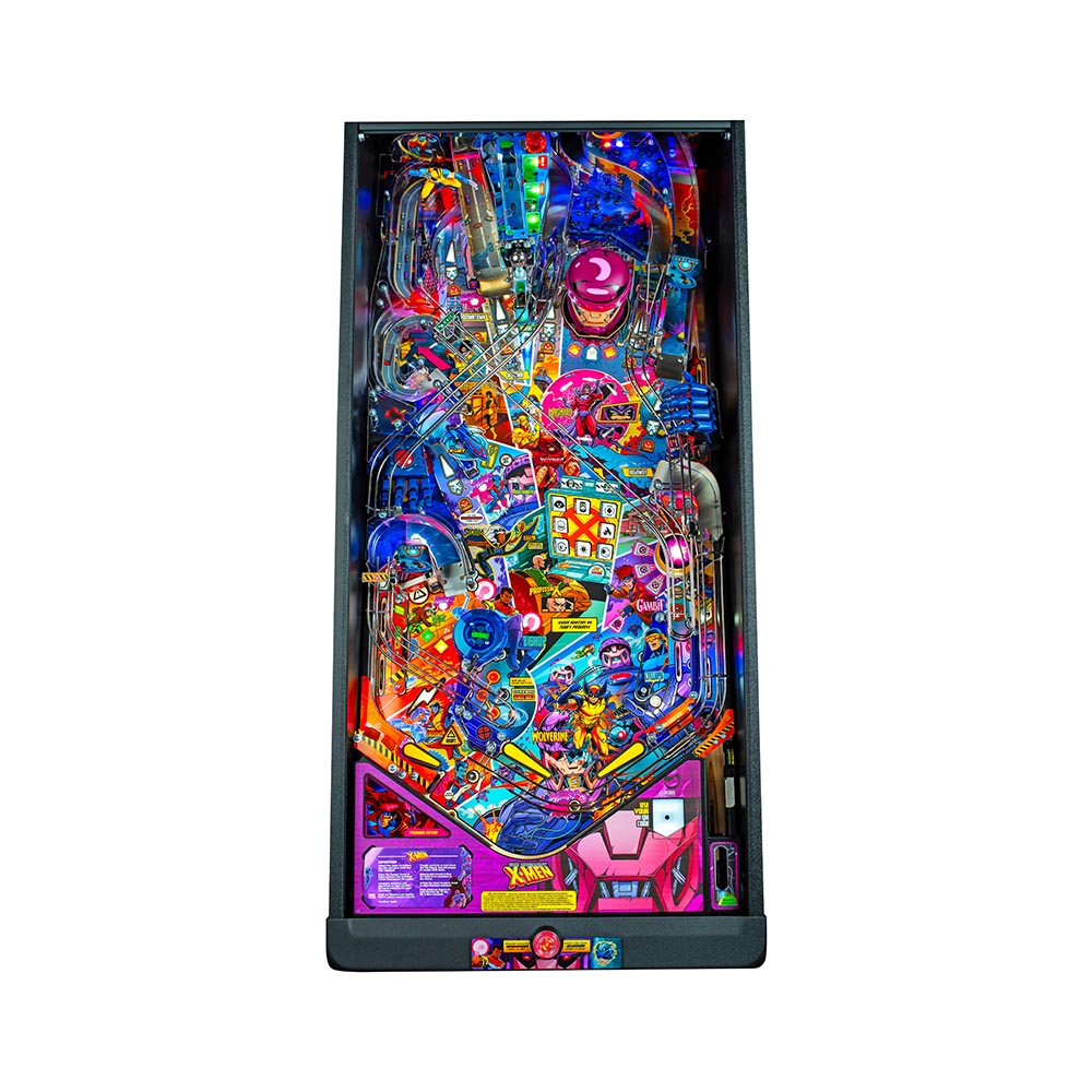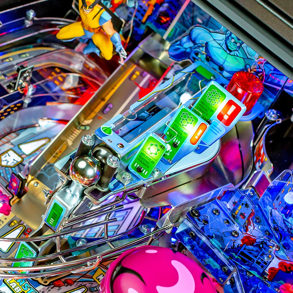 The Uncanny X-Men playfield is a unique pinball layout that features an array of new crossing shots and ramp designs with surprising ball trajectories to deliver kinetic satisfaction. The all-new Danger Room design, located to the left of the main flippers, offers a high-risk, high-reward experience that includes a mini-flipper and a novel outlane spinner. Premium and Limited Edition models also include an all-new elevated captive ball vari-target themed as Beast’s Lab.