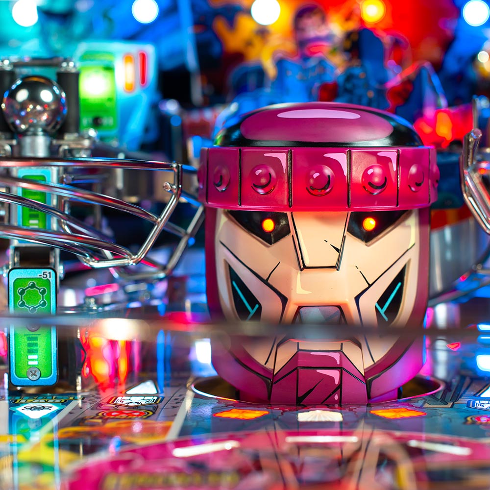The Uncanny X-Men pinball game features a mechanically articulated Sentinel for the player to battle. The Sentinel’s large robotic head changes its state based on the player’s actions. In the Premium and Limited Edition models, the Sentinel rises from underneath the playfield and fights back by destroying the player’s ramps or attacking the ball with its extended hands.