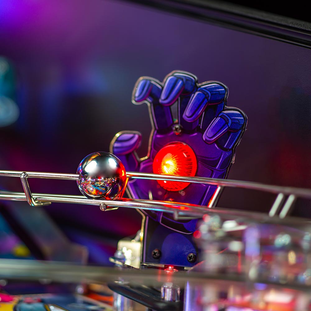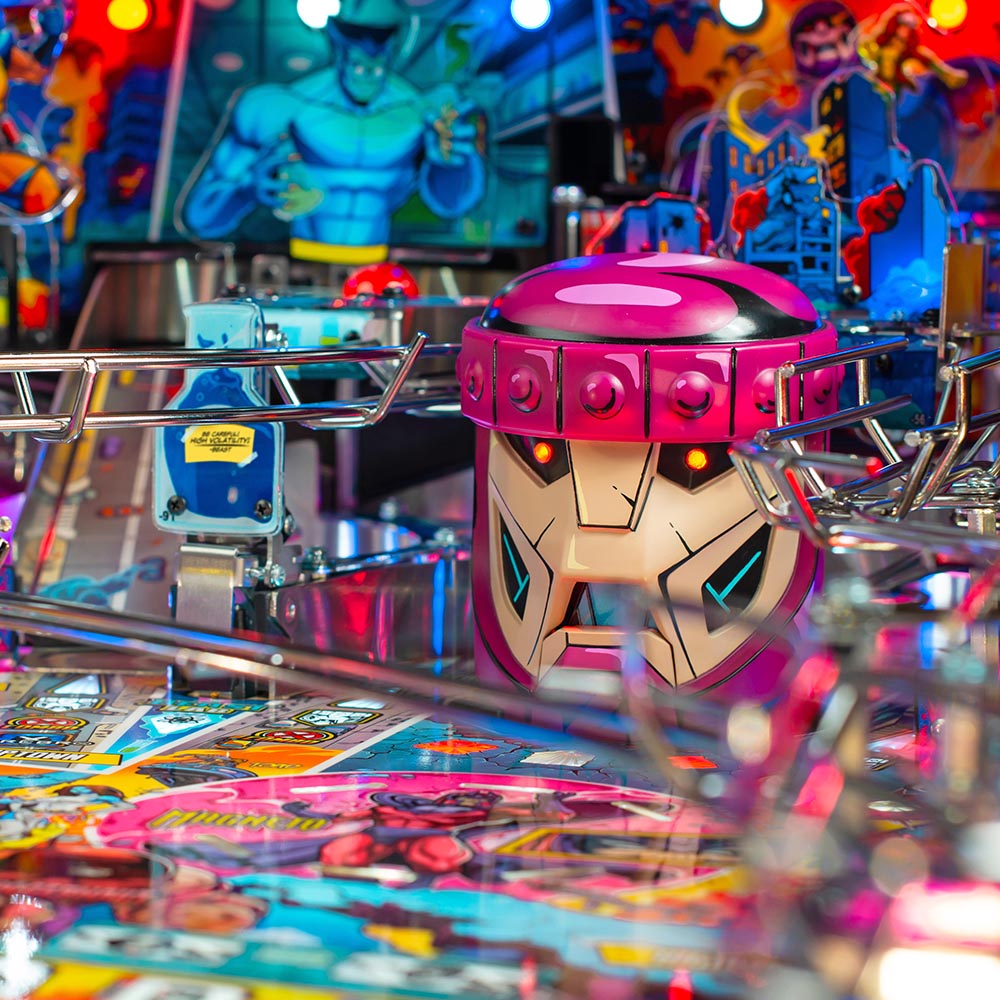 The Uncanny X-Men pinball game features a mechanically articulated Sentinel for the player to battle. The Sentinel’s large robotic head changes its state based on the player’s actions. In the Premium and Limited Edition models, the Sentinel rises from underneath the playfield and fights back by destroying the player’s ramps or attacking the ball with its extended hands.