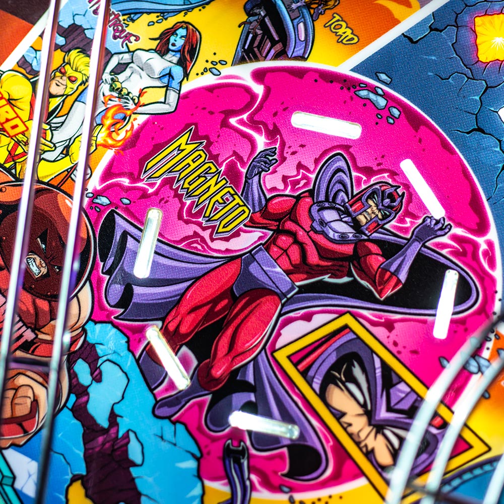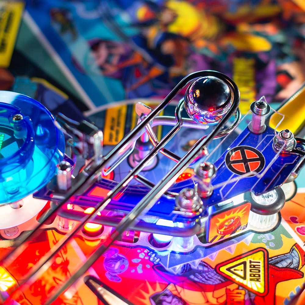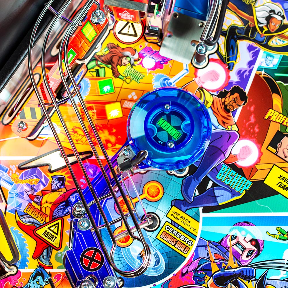 The Uncanny X-Men playfield is a unique pinball layout that features an array of new crossing shots and ramp designs with surprising ball trajectories to deliver kinetic satisfaction. The all-new Danger Room design, located to the left of the main flippers, offers a high-risk, high-reward experience that includes a mini-flipper and a novel outlane spinner. Premium and Limited Edition models also include an all-new elevated captive ball vari-target themed as Beast’s Lab.