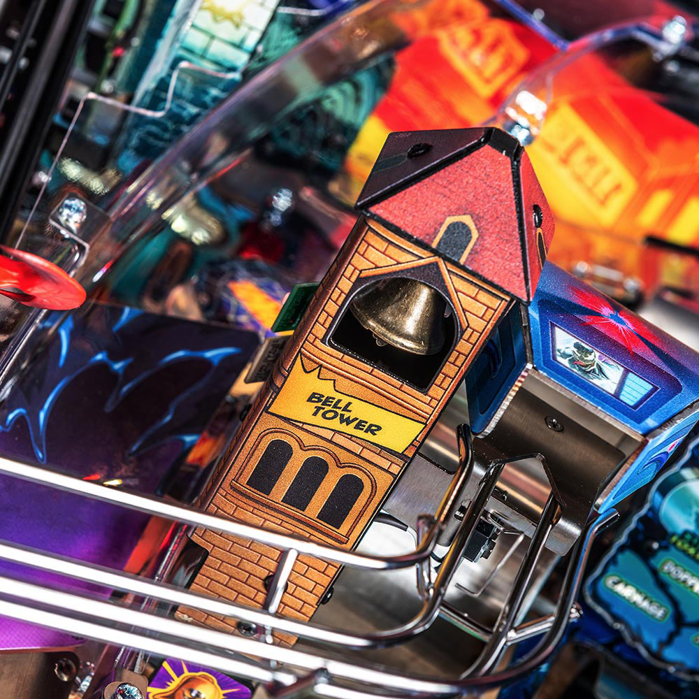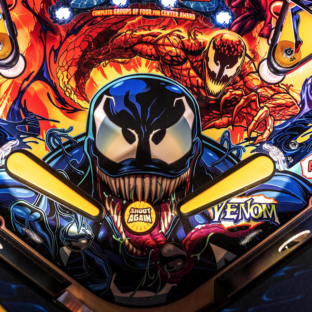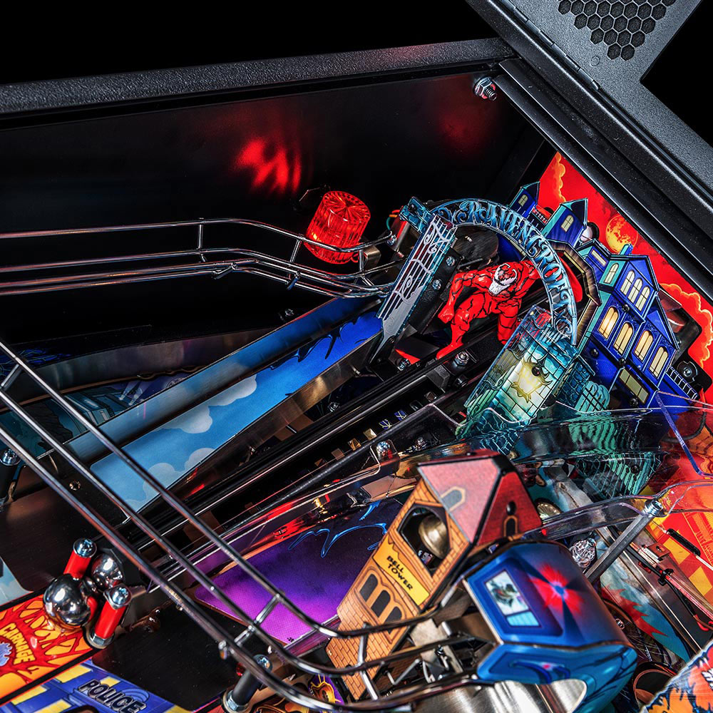 Playing as Venom, gamers will select a host to bond with at the start of each game, altering the entire gaming experience both physically and digitally. Vertical pinball lock symbiote containment vessels located on both sides of the playfield lock and quickly release balls for constant frenetic action as players explore shots through the mechanically changing Agro-Lab and Life Foundation pathways. Players will bash an interactive, custom sculpted Carnage captive ball back into Ravencroft Institute for the Criminally Insane. Additionally, a surprise Doppelganger attack can swing into action at a moment’s notice, unveiling three uplift targets wreaking chaos.