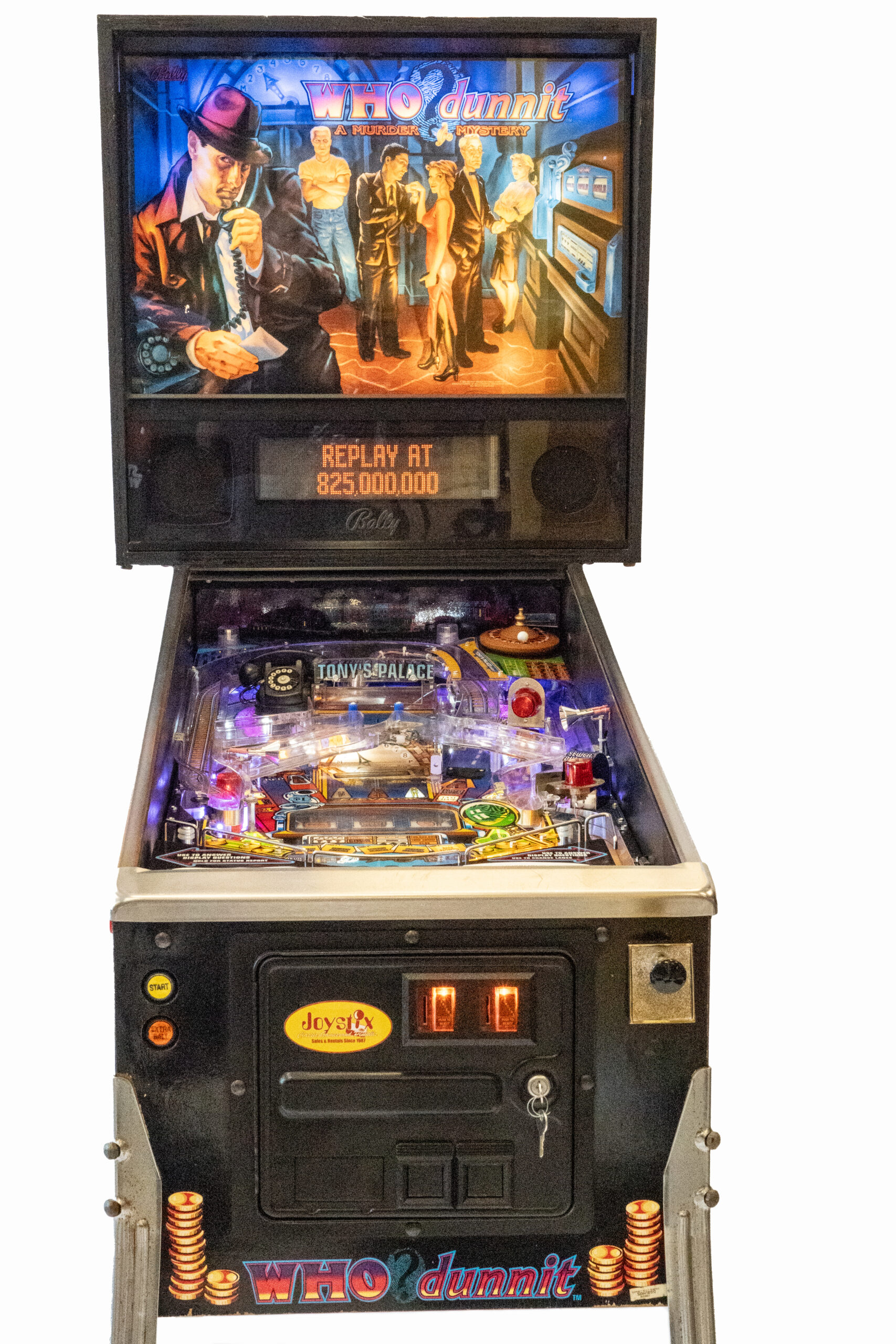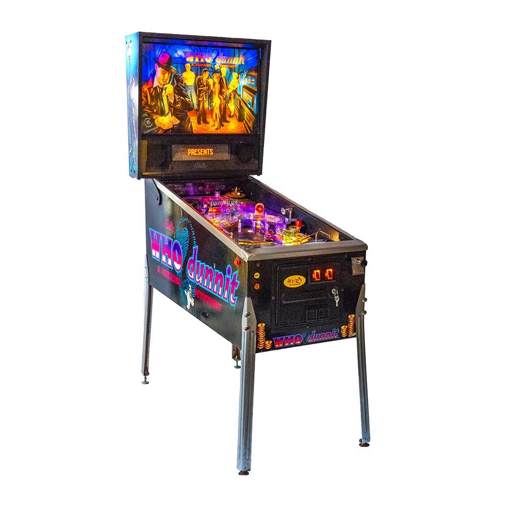 WHO dunnit is a Midway pinball machine with a 1940s style and a murder mystery theme. The playfield features up to five different murder mysteries in which the player must find clues and evidence by making indicated shots. The machine accepts up to four players, and features four-ball play.